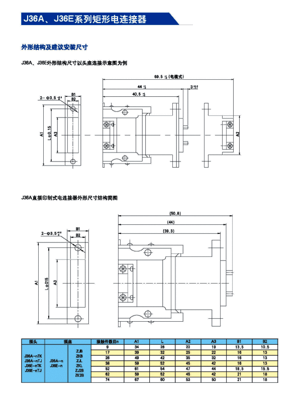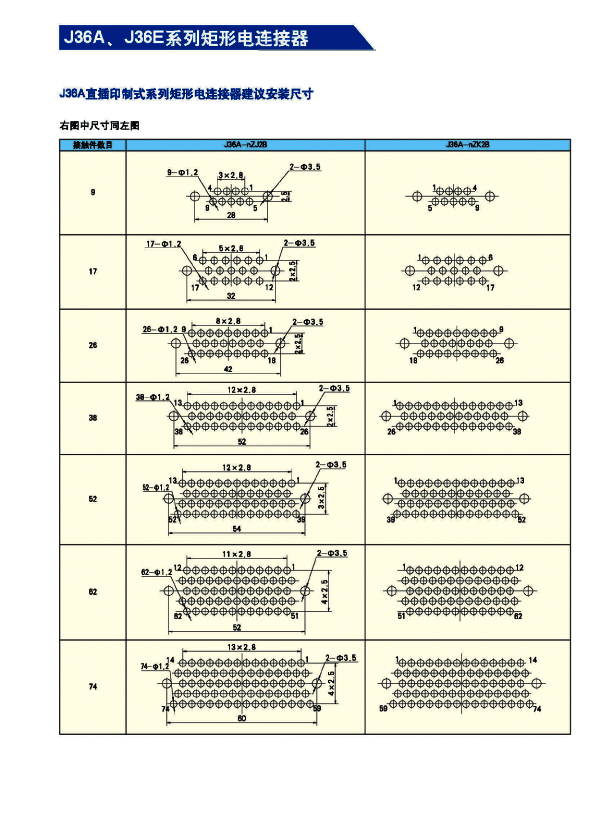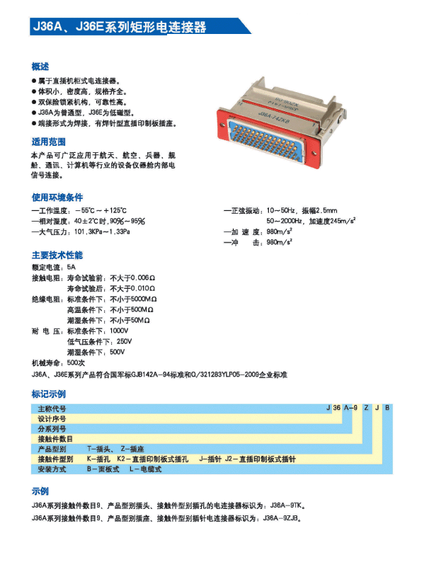 J36A,E矩形航空接插件,執(zhí)行Q/HD20038-2007詳細規(guī)范,屬于儀器式電連接器。具有體積小、密度高、規(guī)格齊全、雙保險鎖緊結(jié)構(gòu)、可靠性高等優(yōu)點,端接形式為焊接式和直插印制板式。廣泛應(yīng)用于航天、航空、兵器、艦船、通訊、計算機等行業(yè)的設(shè)備儀器艙內(nèi)部電信號連接。