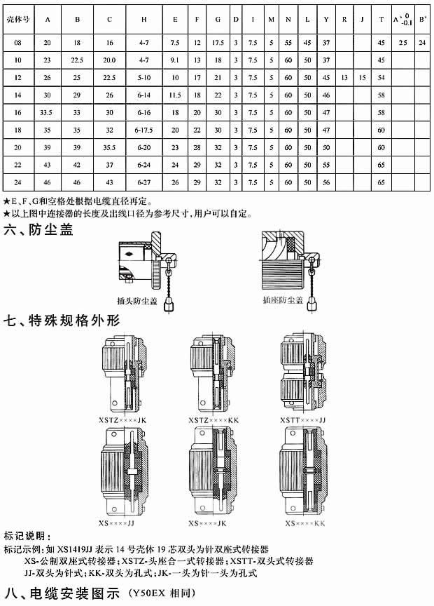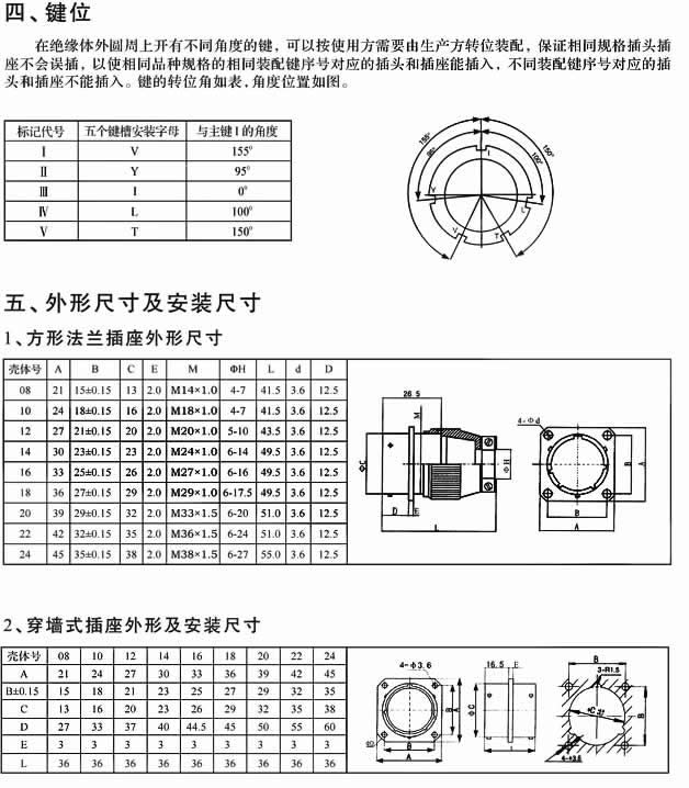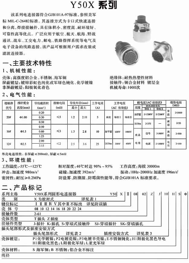 Y50X-1832ZK10/TK2航空電連接器。包括公制、英制、電源三大類電連接器。均為內(nèi)螺旋槽卡銷鎖緊式。具有快捷連接與分離,體積小、重量輕,密封性能好,抗拉性能優(yōu)之特點。插頭電纜罩有七種安裝方式,殼體分屏蔽與非屏蔽,電纜引出有直式和彎式,端接方式為焊接式。品種多,規(guī)格全。Y50X圓形接插件均參照GJB101A—97,GJB598A—96,MIL—C—26482等標(biāo)準(zhǔn)的要求。適用于戰(zhàn)略、戰(zhàn)術(shù)系統(tǒng),野外作業(yè)等電訊號、電能的連接。